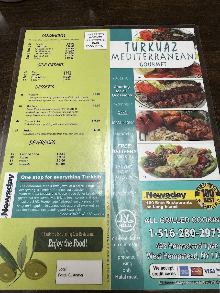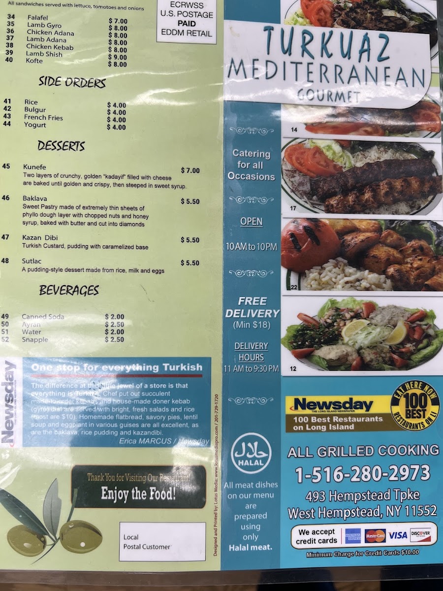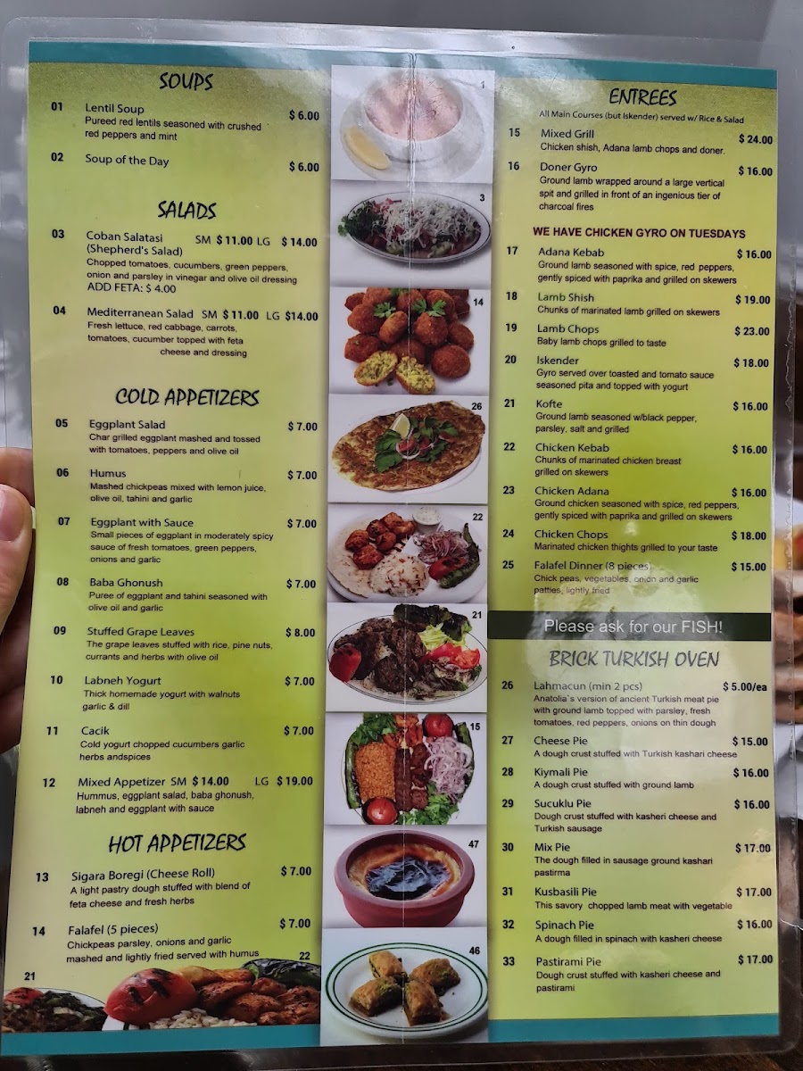 Ground lamb wrapped around a large vertical spit and grilled in front of an ingenious tier of charcoal fires. Served with rice and salad.